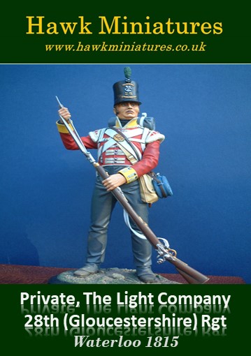 Hawk Miniatures is proud to present a 100mm fine scale model figure kit of a Private, The Light Company, The 28th of Foot (North Gloucestershire) Regiment, Waterloo 1815.